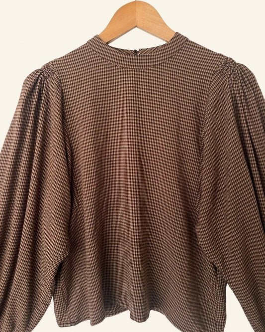 SAMSOE SAMSOE gingham checked brown blouse with puff sleeves