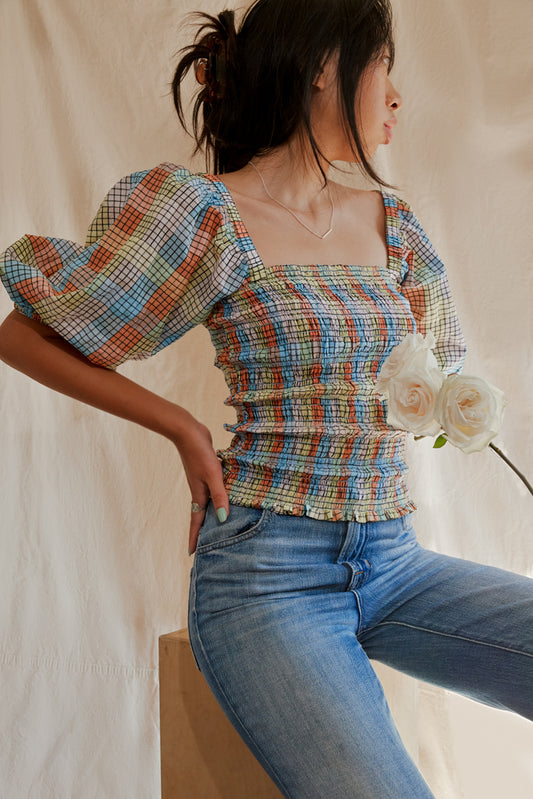 GANNI multicolored seersucker puff sleeves smock top blouse