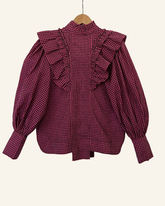 GANNI seersucker checkered gingham pink and black ruffled blouse with puff sleeves