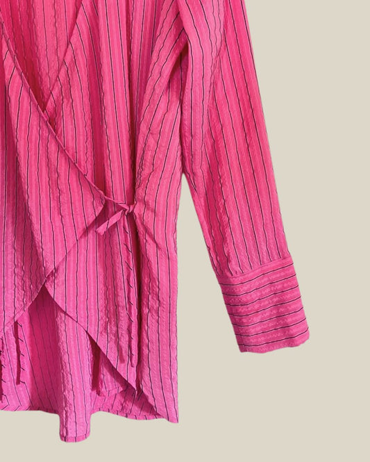 Blouse chemise portefeuille rose en soie GANNI à fines rayures noires
