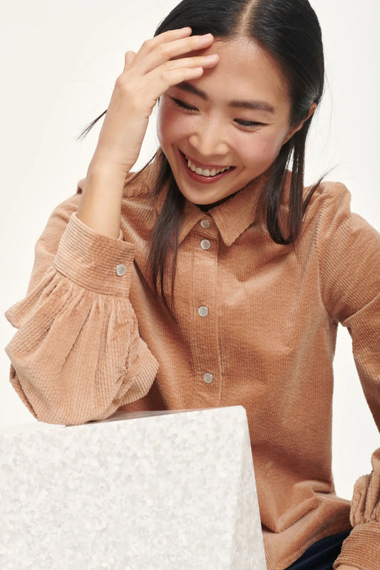 SAMSOE SAMSOE camel beige corduroy velvet shirt with puff sleeves