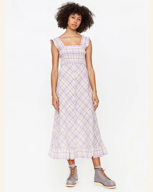 GANNI Beautiful long lilac and cream ruffled seersucker checked summer dress