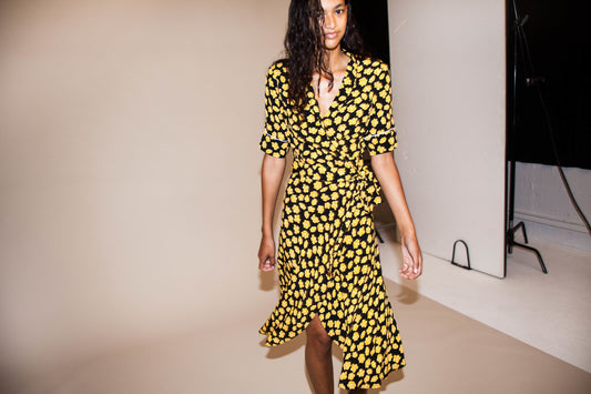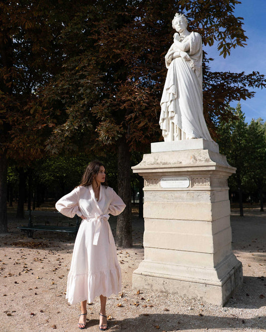 Robe portefeuille ceinturée ivoire "Niki" de STINE GOYA avec volants et manches ballon