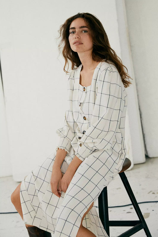 GESTUZ "Linoa" long checkered white dress with puff sleeves